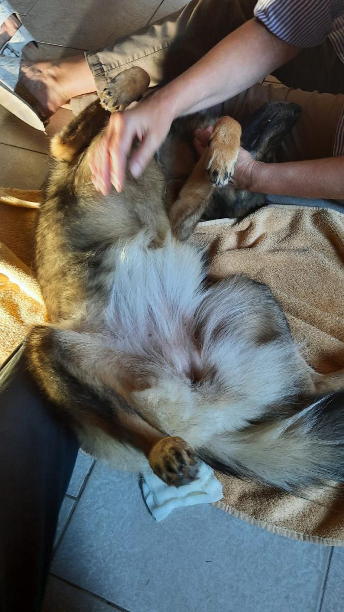 Während Karin Dara hält und mit ihr spricht, reinige ich die Stelle mit warmen Wasser.