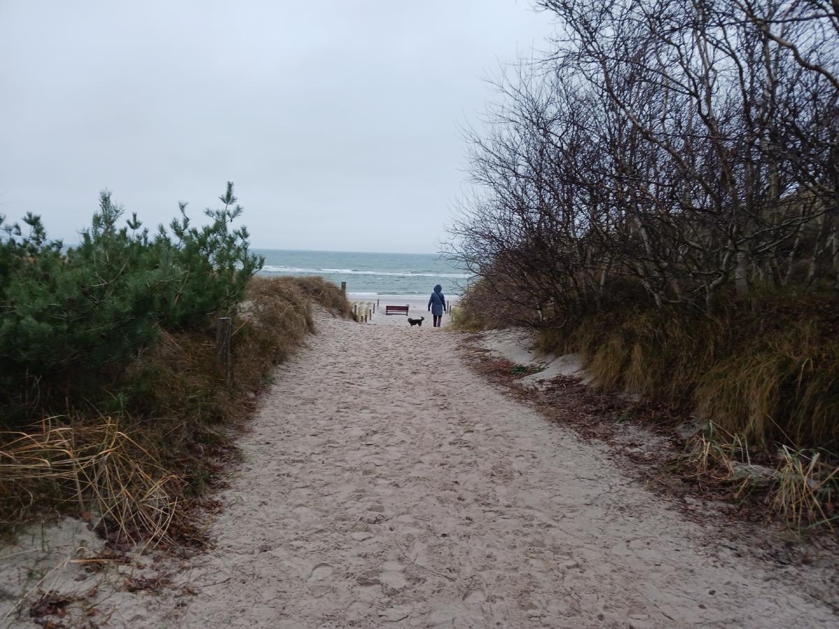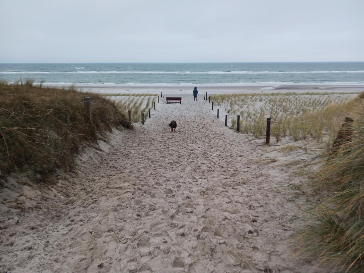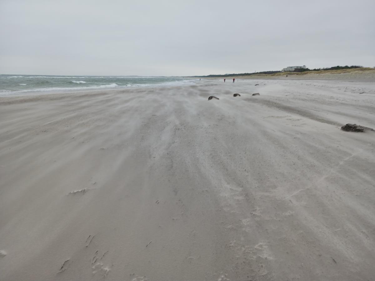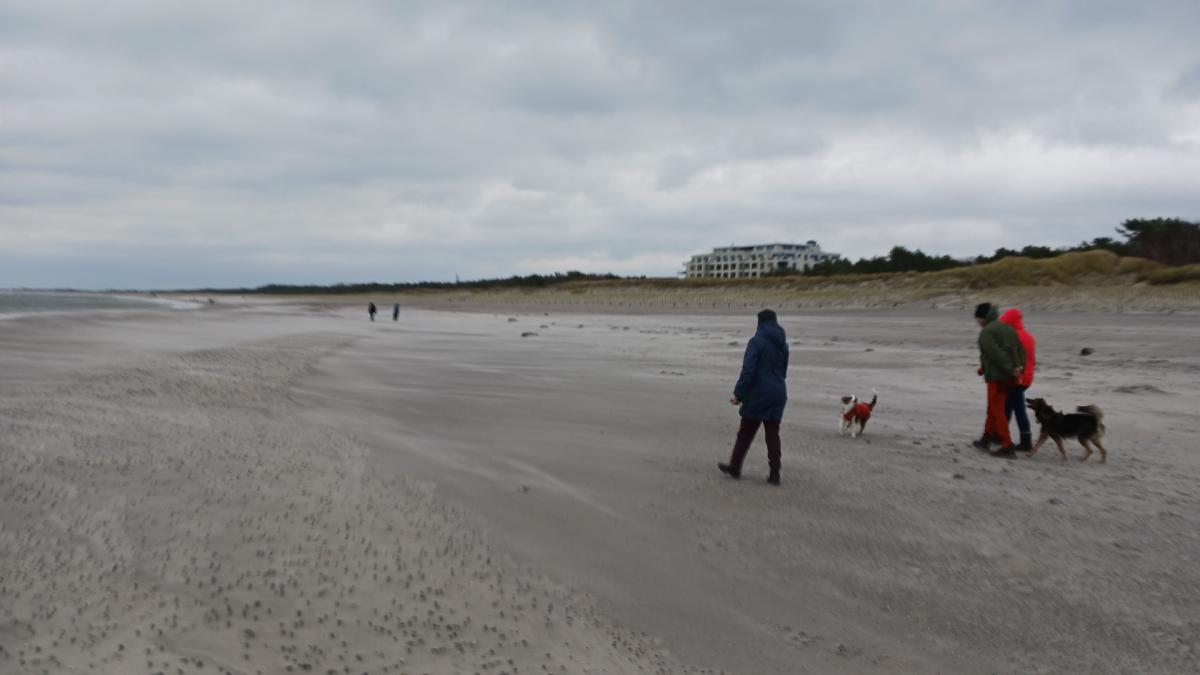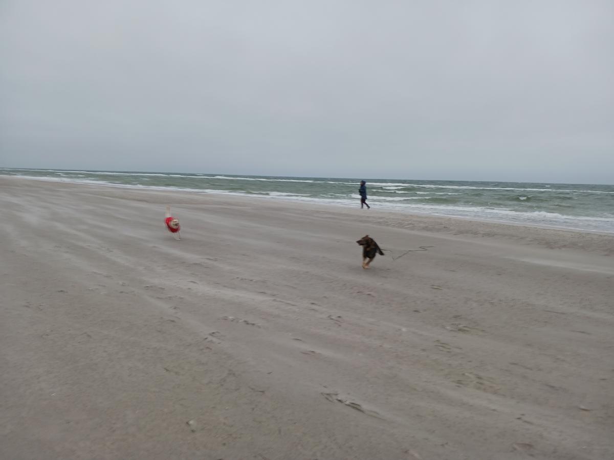Nach ersten Versuchen gegen den Wind mit Windstärke 8 gehen haben wir uns später für eine bessere Lösung entschieden. Erst den Weg in Richtung Graal-Müritz einschlagen und dann einen späteren Strandzugang nutzen. Vorteil für alle, der Wind kommt von Hinten und Dara hatte keien Probleme mit dem aufgewirbelten Sand.