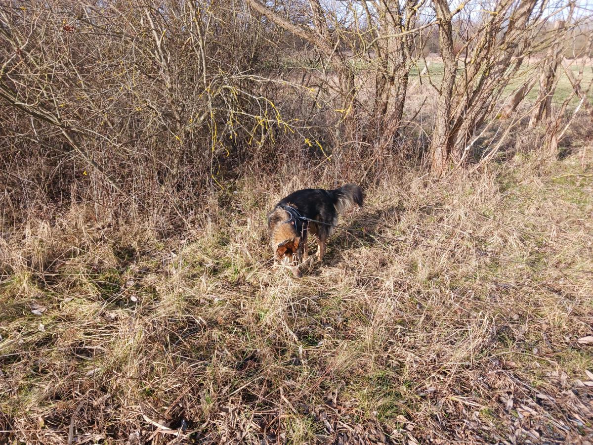Bei dem Sonnenschein haben wir dann noch einen längeren Spaziergang unternommen. Auf dem Rückweg kamen wir dann zu dem Weg auf dem wir vor zwei Tagen eine Fährte gelegt hatten. Wir wollten mal sehen, wie Dara reagiert.