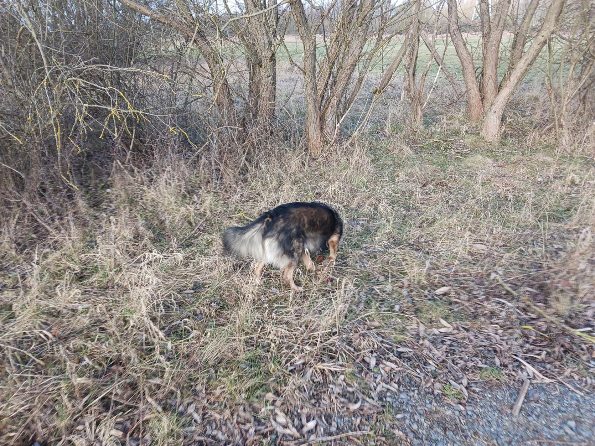 Dara hatte die Spur am Start aufgenommen und war dieser auch gut gefolgt, einmal habe ich sie korrigiert und letztendlich hat sie "Jackpot" auch gefunden. Allerdings, so hatte es den Anschein, ist sie zu ihm gelaufen weil der Duft über den Wind in ihre Nase kam.
