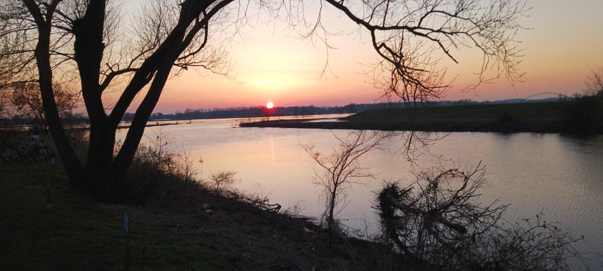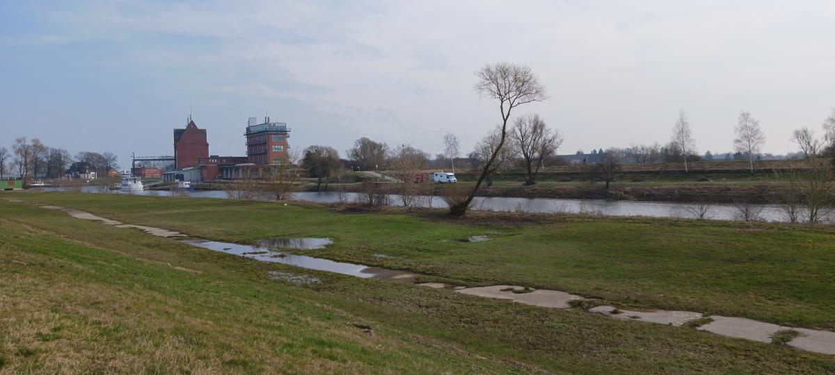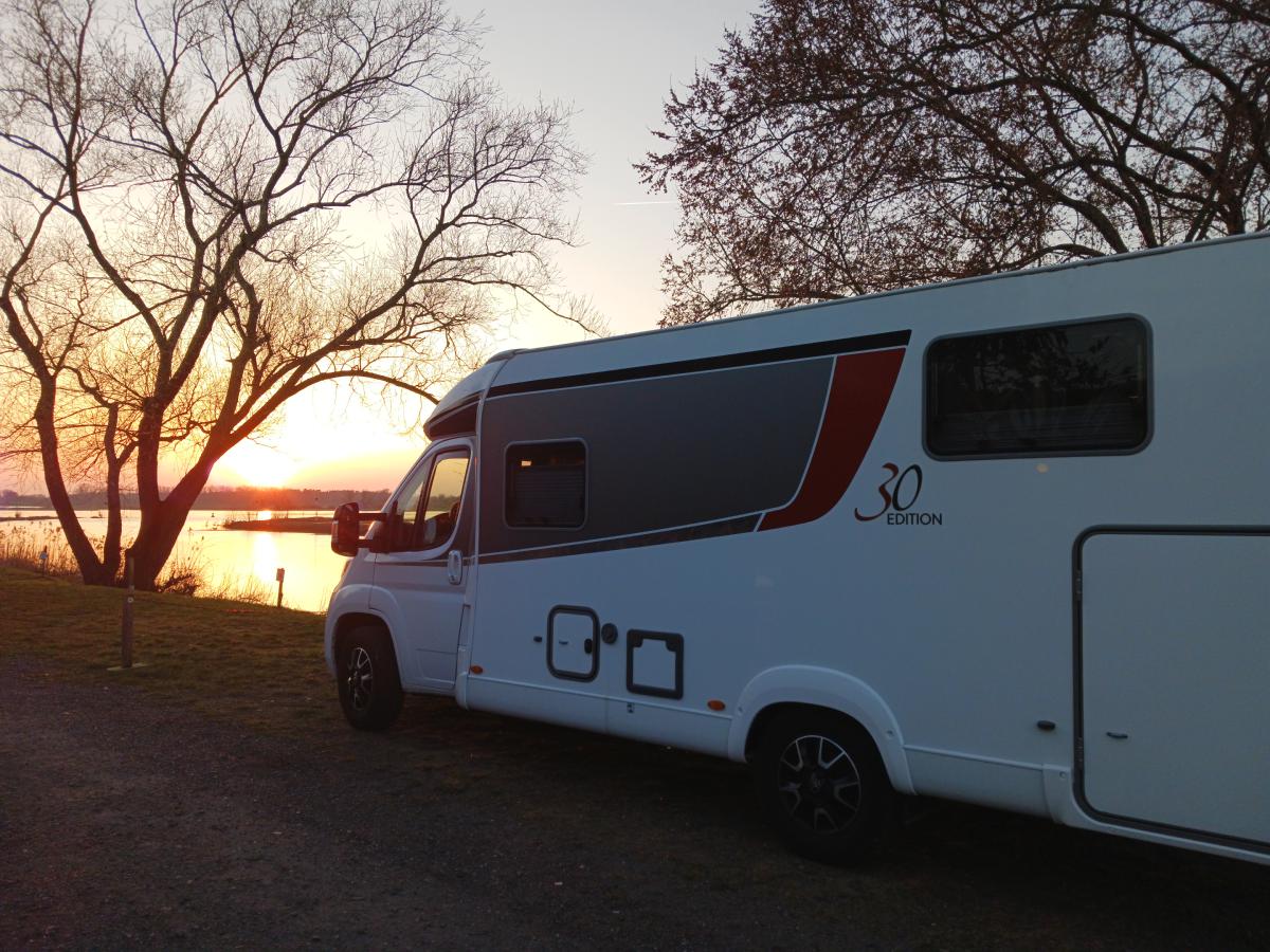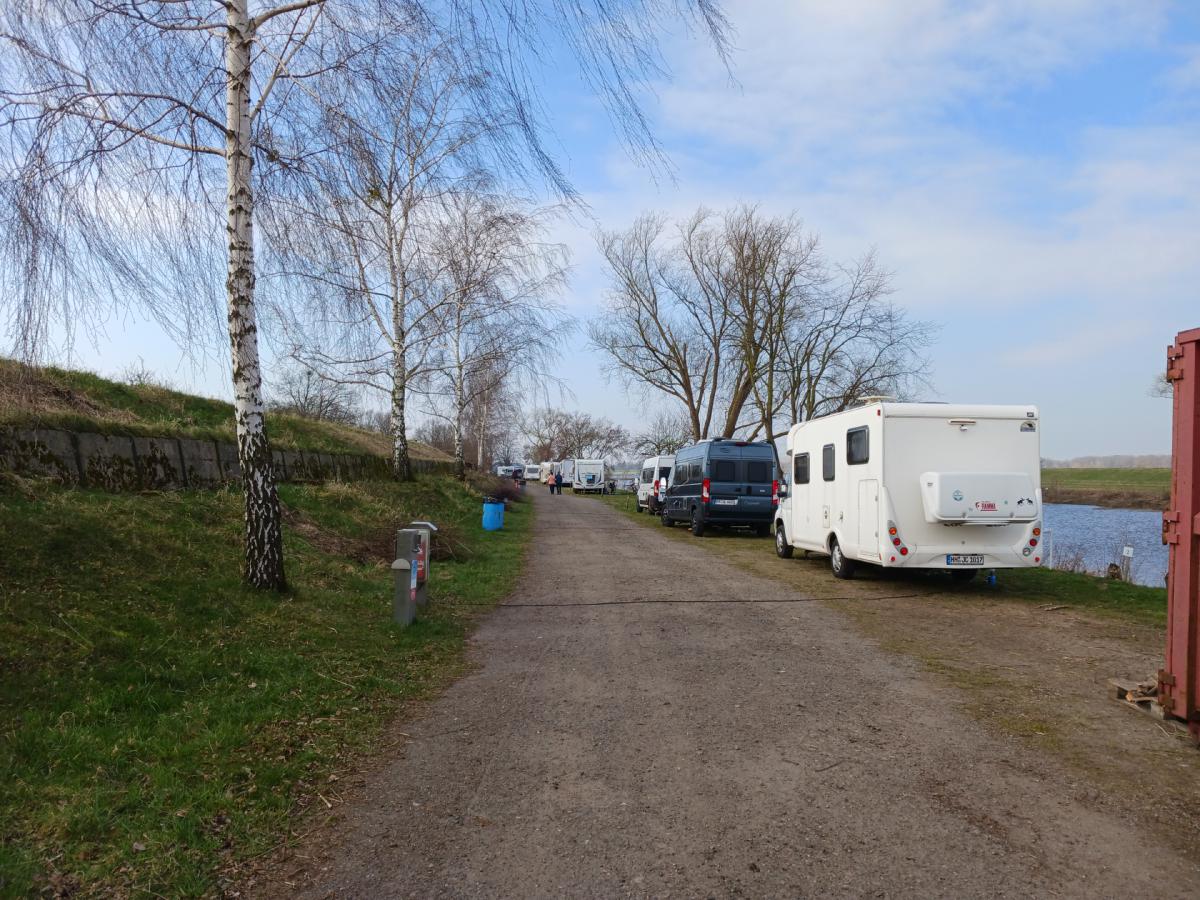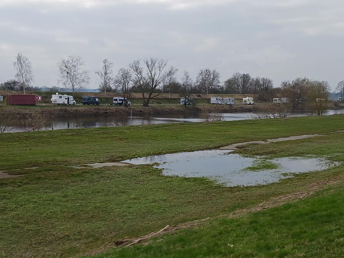 Blick vom gegenüberliegenden Deich. Wir sind fast die Letzten auf dem Stellplatz.